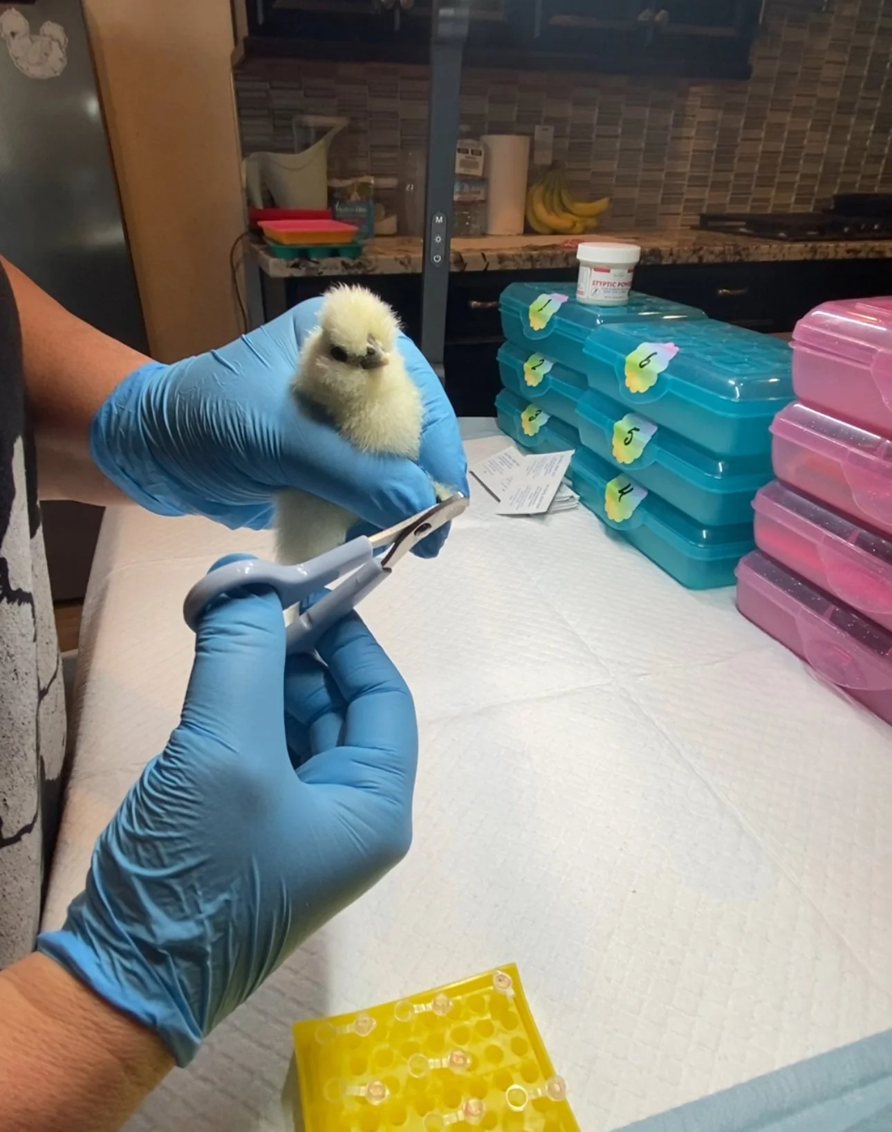 Gently but firmly hold your chick. Trim just the tip of one toenail—enough to draw a couple small drops of blood.
